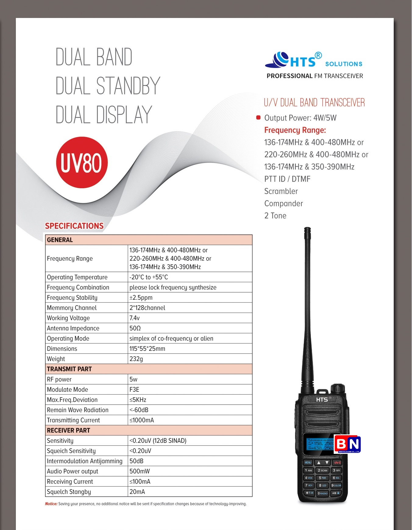 Với khả năng hoạt động trên 2 băng tần, nghe song tần, màn hình kép cùng các tính năng bảo mật hiện đại, HTS UV80 mang đến giải pháp liên lạc hiệu quả cho mọi môi trường làm việc.