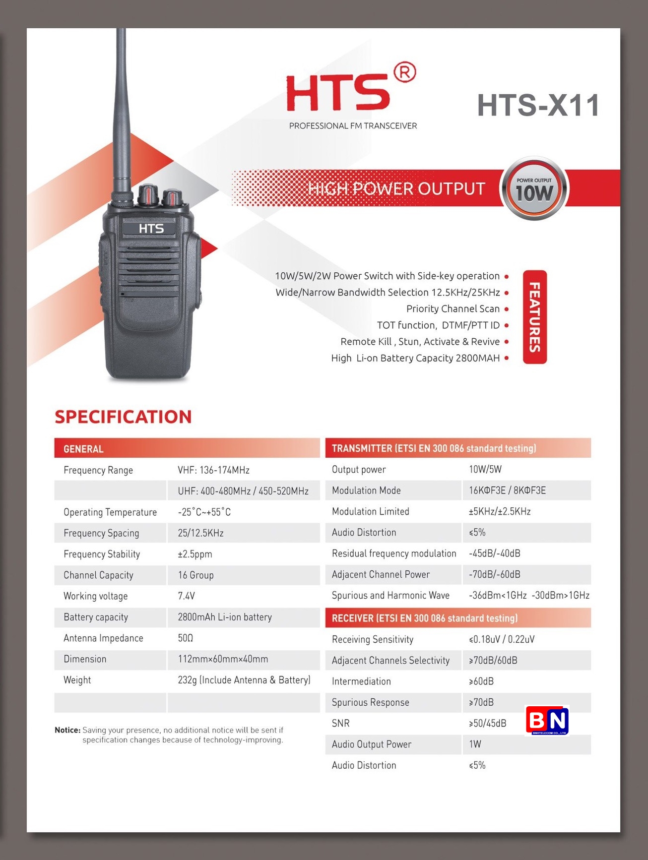 HTS-X11 là dòng bộ đàm chuyên nghiệp được thiết kế cho môi trường làm việc cường độ cao như công trình xây dựng, bảo vệ an ninh, nhà máy sản xuất và kho vận. Với công suất phát mạnh mẽ 10W cùng nhiều tính năng điều khiển linh hoạt, thiết bị mang lại khả năng liên lạc xa, âm thanh rõ ràng và độ bền cao.
