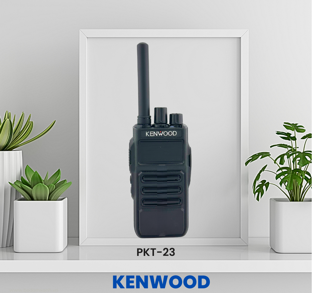 - Máy bộ đàm Kenwood PKT-23 là dòng bộ đàm cầm tay nổi bật của hãng Kenwood. Bộ đàm có ưu điểm nổi trội: mỏng, nhỏ và nhẹ cùng chất lượng âm thanh tuyệt vời.